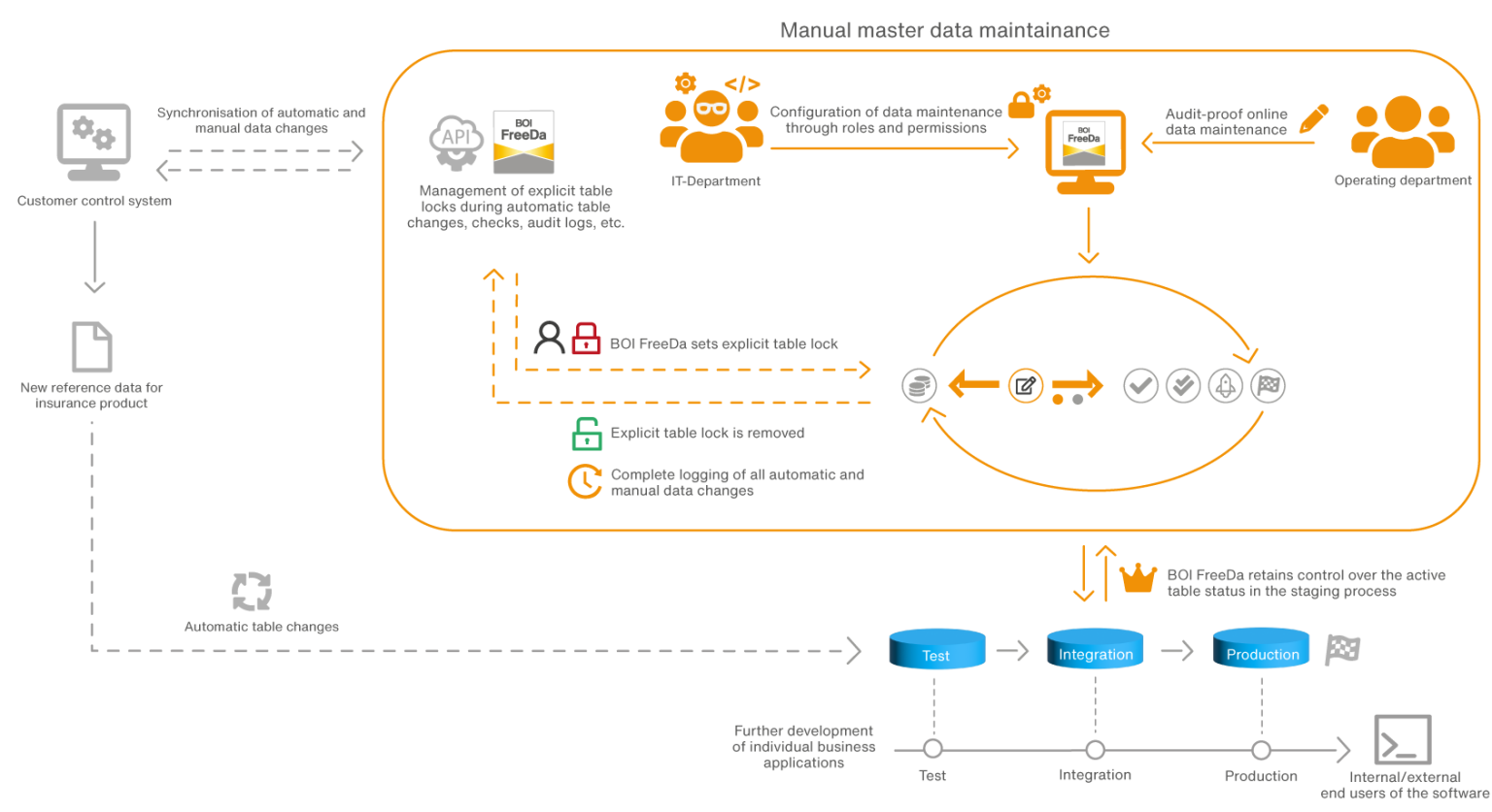 The operating departments manually maintain tables via the BOI FreeDa front end. The IT department configures data maintenance through role- and authorization-based systems, ensuring that only authorized persons can read, edit, verify, or release tables. To ensure data consistency during automatic and manual changes, the customer control system communicates with BOI FreeDa via a REST interface before making automatic changes.