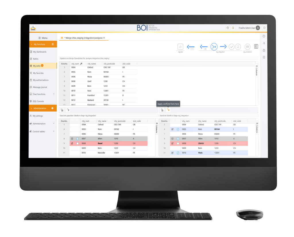 BOI FreeDa and the BOI FreeDa Staging add-on module provide a comprehensive solution for the maintenance, staging, and release management of all business-critical data — fully configurable, highly automated, and audit-proof.