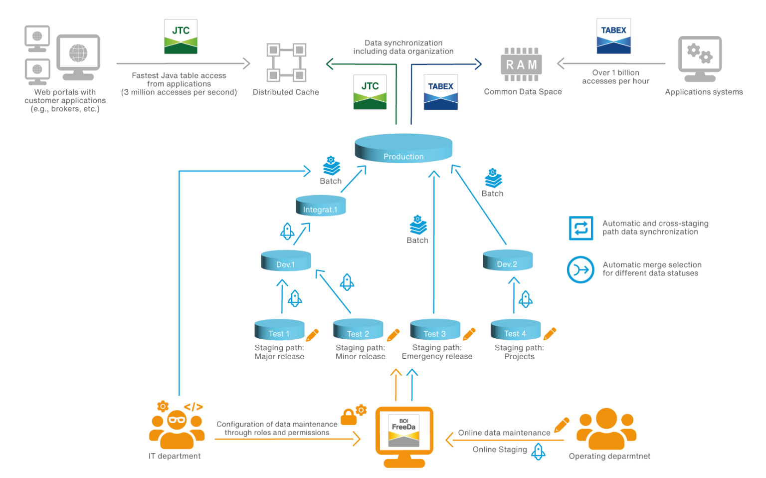 For over 30 years, BOI‘s standard software, TABEX4, has provided high-performance, auditable data access for business applications on mainframe computers. The BOI product JTC is used for decentralized Java-based portals. Now, the maintenance of data is to be modernized, and a standardized process is to be implemented for the maintenance and staging of critical business data.
