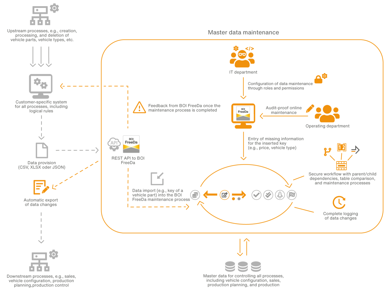Creation of new master data: New master data (e.g., new vehicle parts) is recorded in the upstream processes. This new data must be enriched with additional information from the operating departments before being transferred to the databases. This data is transmitted in various formats (e.g., CSV, XLSX) from the customer’s control system to BOI FreeDa via a REST API.