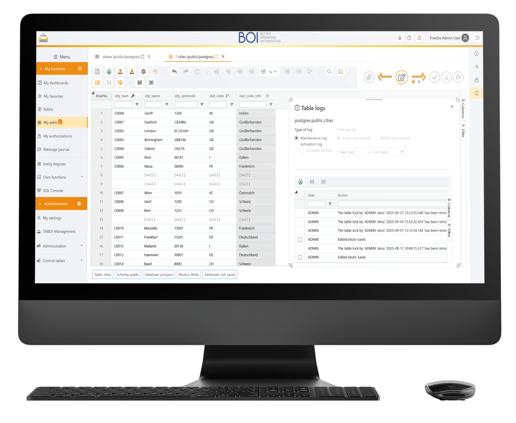The IT department uses table processes, roles, and authorizations to configure data maintenance, also using external systems. Employees from the operating departments edit existing data records via the BOI FreeDa online interface without needing database knowledge, based on the defined table maintenance processes. Data changes are only activated in the databases once the table maintenance processes in BOI FreeDa are complete.