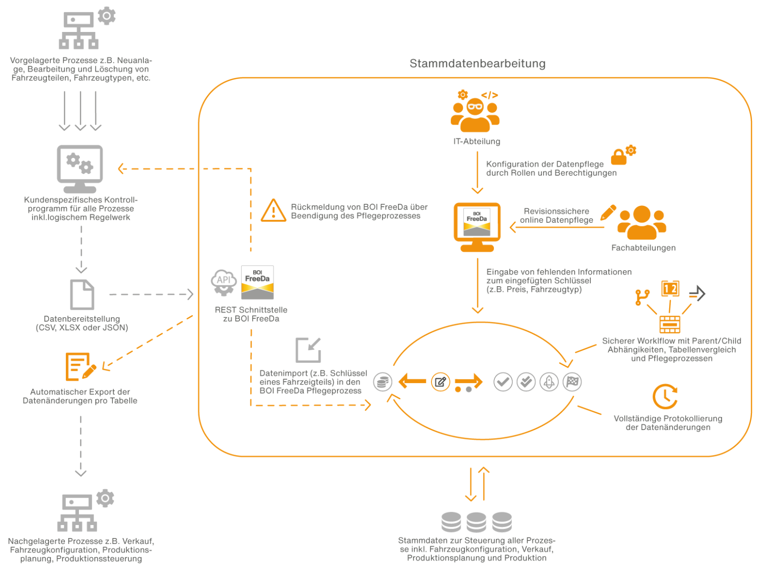 Neuanlage von Stammdaten: In den vorgelagerten Prozessen werden neue Stammdaten, z.B. neue Fahrzeugteile erfasst. Bei Neuanlage von Stammdaten müssen diese vor Übernahme in die Datenbanken durch weitere Informationen der Fachabteilungen angereichert werden. Diese Daten werden in verschiedenen Formaten (CSV, XLSX, etc.) vom Kunden Kontrollprogramm über eine REST-API an BOI FreeDa übermittelt.