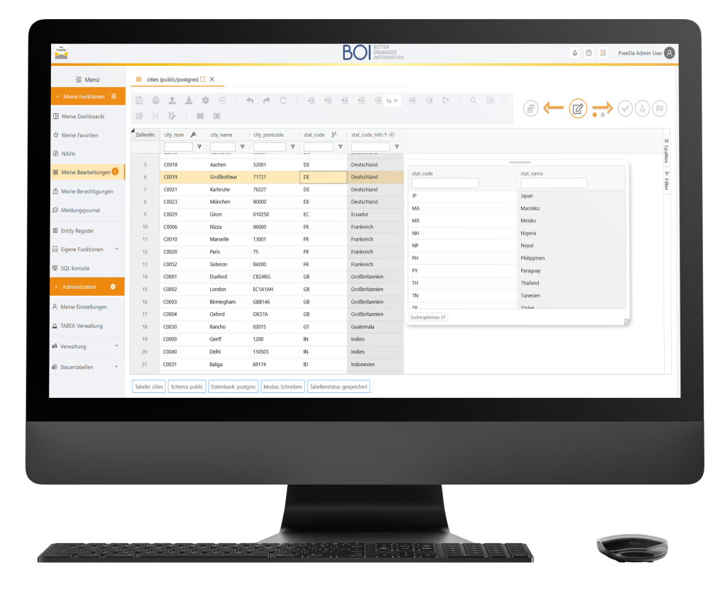 Die IT-Abteilung konfiguriert die Datenpflege über Tabellenprozesse, Rollen und Berechtigungen – auch unter Nutzung externer Systeme. Die Bearbeitung vorhandener Datensätze erfolgt über die Online-Oberfläche von BOI FreeDa durch Mitarbeiter:innen aus den Fachabteilungen ohne Datenbankkenntnisse anhand der definierten Tabellenpflege- Prozesse. Datenänderungen werden erst bei Abschluss der Tabellenpflege-Prozesse in den Datenbanken aktiviert.